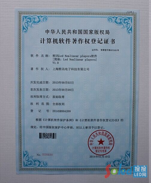 您當(dāng)前的位置:首頁(yè) » 榮譽(yù)資質(zhì) » 計(jì)算機(jī)軟件著作權(quán)登記證書(shū)--熙訊LED軟件