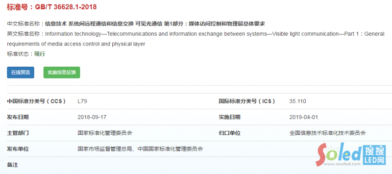 據(jù)全國標(biāo)準(zhǔn)信息公共服務(wù)平臺信息顯示,由全國信息技術(shù)標(biāo)準(zhǔn)化技術(shù)委員會提出并歸口,國家市場監(jiān)督管理總局、中國國家標(biāo)準(zhǔn)化管理委員會發(fā)布的《信息技術(shù)系統(tǒng)間遠(yuǎn)程通信和信息交換 可見光通信 第1部分:媒體訪問控制和物理層總體要求》標(biāo)準(zhǔn)號:GB/T 36628.1-2018于4月1日正式實施。