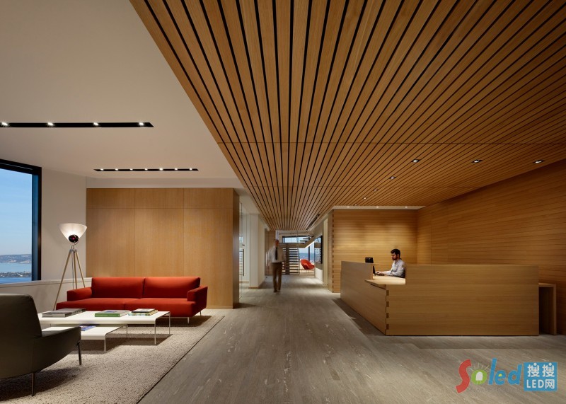 此幢位于舊金山的經(jīng)過(guò)改擴(kuò)建的52層地標(biāo)性摩天大廈是一家著名全球投資公司的總部。照明設(shè)計(jì)尊重了建筑本身的幾何結(jié)構(gòu),同時(shí)加強(qiáng)了簡(jiǎn)約的設(shè)計(jì)感。GE 7W LED MR16卡槽燈為其大堂和招待區(qū)提供了常規(guī)照明。線性LED軟燈帶圍繞在大廳和用餐區(qū)木質(zhì)天花板的四周,既產(chǎn)生光暈效果帶來(lái)美感,又加強(qiáng)了這些場(chǎng)所特質(zhì)。在會(huì)議室和辦公室,集成于隔音天花板內(nèi)的熒光可調(diào)節(jié)GE T5 Watt-Miser®燈保持著室內(nèi)必要的光線水平。同時(shí),7W 嵌入式LED MR16燈為所有場(chǎng)所提供了局部的次要照明。而在充滿挑戰(zhàn)的兩層高交易大廳內(nèi),窄射束卡槽LED燈在提供常規(guī)照明的同時(shí)還能控制交易大廳內(nèi)50寸純平顯示器所產(chǎn)生的眩光。