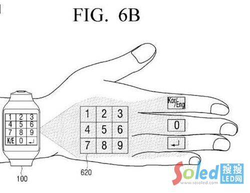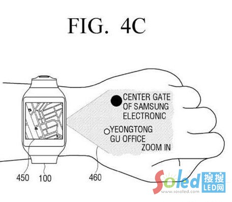 專利顯示當(dāng)我們戴上智能手表時,手表一側(cè)會將屏幕畫面投射到手背或者手臂上,和一些頭戴虛擬現(xiàn)實設(shè)備類似,你同樣能夠?qū)嬅嫱渡涞綁γ嫔。從專利草圖上可以看出三星手表能夠?qū)芴柋P、地圖以及菜單欄等投射到手上放大顯示,另一方面也可以在投射的皮膚上實現(xiàn)操作。