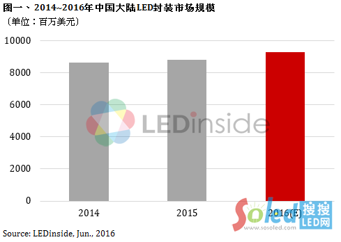 LEDinside分析師余彬表示,2016年照明廠商回補(bǔ)庫(kù)存的需求出籠,使得LED芯片廠商稼動(dòng)率提升,市場(chǎng)出現(xiàn)回暖跡象。上游LED芯片價(jià)格止跌,僅少數(shù)廠商對(duì)LED芯片價(jià)格漲價(jià),因而短期內(nèi)LED封裝價(jià)格將維持穩(wěn)定。然由于LED行業(yè)進(jìn)入成熟期,且因技術(shù)提升,背光市場(chǎng)等部分應(yīng)用領(lǐng)域市場(chǎng)規(guī)模已開始萎縮。LEDinside預(yù)估2016年中國(guó)大陸LED封裝市場(chǎng)規(guī)模為93億美元,同比增長(zhǎng)5%。
