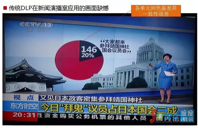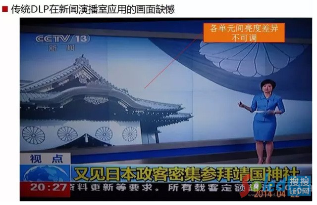 當前主流室內大屏幕顯示技術,還都難以克服光源亮度衰減所造成的整屏顯示效果不一致的問題。例如對于DLP背投拼接墻來說,即使使用當前最新的LED光源,也存在光源亮度隨使用時間的增加而衰減的情況,而每一個光源的衰減程度都不相同,就導致了每個顯示單元的亮度不一致,顯示人臉的時候更會出現(xiàn)“陰陽臉”,LCD/PDP顯示也同樣存在這一問題。