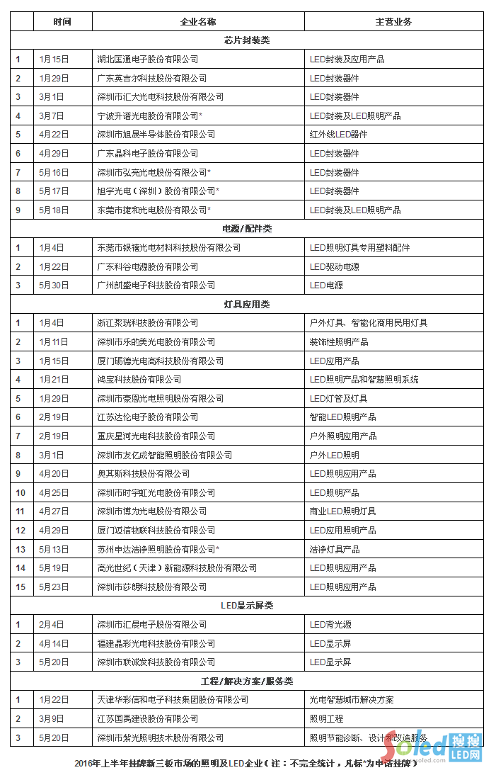 來自近期網(wǎng)絡上的不完全統(tǒng)計,僅2016的上半年(截至1月1日-6月31日)就有不下于33家的LED企業(yè)宣布掛牌新三板(見下表),一躍走上資本運作道路。然而,許多LED企業(yè)新三板上市后所呈現(xiàn)的“虛火”就頗令人尷尬,投資不是特別理想,有的甚至因為成交量過低逐漸淪為了“僵尸股”。因此,LED企業(yè)應該如何深入了解新三板乃至玩轉新三板,也自然而然地成為了不少業(yè)內(nèi)人士共同關注的問題。