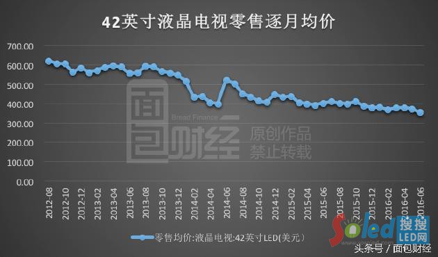 2016年6月42英寸液晶電視的零售均價為356美元,同比下降11.66%;而在2013年6月,這一價格還高達558美元。三年時間,液晶電視的零售價格減少了近200美元,跌幅超過三成。