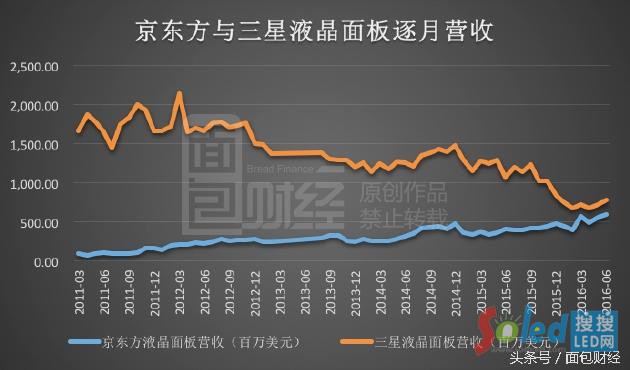 巨額的投資,終于讓京東方的產(chǎn)能向三星、LG等韓資靠攏。下圖是面包財經(jīng)(微信公眾號ID:mbcaijing)整理的京東與三星液晶面板近年來的月度營收情況: