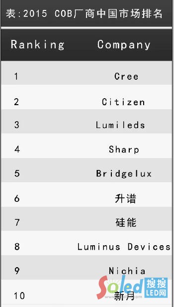 中國廠商中,涉足COB的廠商則更多,包括升譜、硅能、新月和同一方等。COB市場進入者越來越多,市場格局亦發(fā)生了較大的變化,整體上看,目前依然為國際廠商在主導中國COB市場。