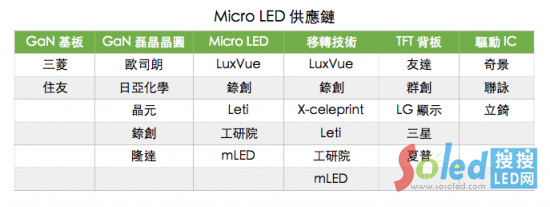 在這場(chǎng)Micro LED領(lǐng)域的誰與爭(zhēng)鋒中,中國(guó)臺(tái)灣地區(qū)不少大廠也已投入技術(shù)研發(fā),包括半導(dǎo)體新創(chuàng)公司錼創(chuàng)(PlayNitride)、臺(tái)工研院、友達(dá)、群創(chuàng)、晶電。其他也在Micro LED爭(zhēng)戰(zhàn)行列的國(guó)際大廠包括Sony、三星、樂金、日亞化學(xué)、夏普等,而從英國(guó)史崔克萊大學(xué)(University of Strathclyde)拆分出來的公司 mLED、美國(guó)德州理工大學(xué)(Texas Tech University)、法國(guó)原子能署電子暨資訊技術(shù)實(shí)驗(yàn)室(Leti)、從伊利諾大學(xué)(University of Illinois)分拆出來的X-celeprint也都積極研發(fā)Micro LED技術(shù)。