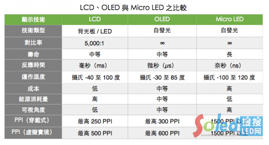 承繼了LED的特性, Micro LED優(yōu)點(diǎn)包括低功耗、高亮度、超高解析度與色彩飽和度、反應(yīng)速度快、超省電、壽命較長(zhǎng)、效率較高等,其功率消耗量約為L(zhǎng)CD的10%、OLED的50%。而與同樣是自發(fā)光顯示的 OLED 相較之下,亮度比其高30倍,且解析度可達(dá)1500PPI(像素密度),相當(dāng)于Apple Watch采用OLED面板達(dá)到300PPI的5倍之多,另外,具有較佳的材料穩(wěn)定性與無影像烙印也是優(yōu)勢(shì)之一。