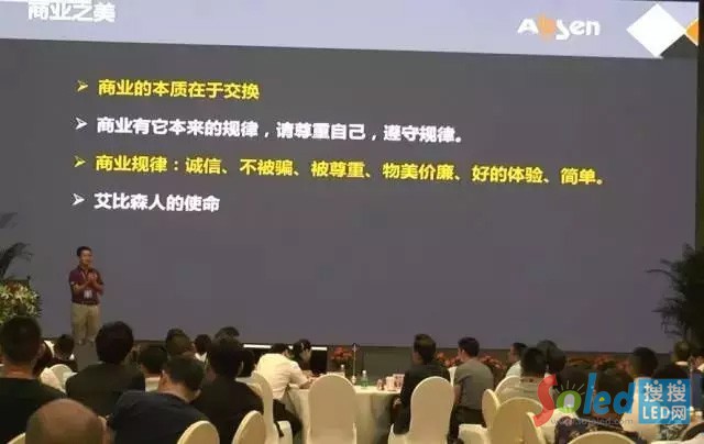 商業(yè)本來是一件很美的事情,我最近在寫一篇文章叫商業(yè)之美,在我的概念里商業(yè)是很美的,像一個(gè)漂亮的女人穿著一件她特別喜歡的衣服一樣,像一道美味佳肴一樣,很甜美。但是商業(yè)到了我們這里之后,到了中國(guó)的民營(yíng)企業(yè)手里之后,已經(jīng)被糟蹋成什么樣子了?我有個(gè)理想,至少我認(rèn)為艾比森公司在中國(guó)商業(yè)發(fā)展史上要干兩件事情,第一,我們要讓我們的員工感受到幸福,第二,我們要讓艾比森成為一個(gè)標(biāo)桿,去影響和改變這個(gè)糟糕的商業(yè)環(huán)境。
