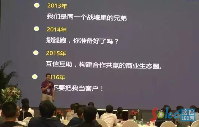 這一點(diǎn)我以前講過,我以為你們明白的,以為你們知道我們是同一個(gè)戰(zhàn)壕里的兄弟,是一伙的,是一根繩上的螞蚱,但后來發(fā)現(xiàn)不是,所以我再次跟大家講一下,你們不要把我當(dāng)客戶。我們經(jīng)營(yíng)理念里面有個(gè)叫做“給客戶創(chuàng)造最大價(jià)值”,那誰是客戶,你想過沒有?如果你們把我當(dāng)客戶的話,你覺得你們把原材料,把你們的燈、PC板、IC等東西賣給我,我把錢付給你,這事就結(jié)束了?我告訴你,我們是一個(gè)戰(zhàn)壕里的兄弟,我給你們的錢不是我付的,最后消費(fèi)我們產(chǎn)品的用戶才是我們的客戶,所以給客戶創(chuàng)造最大價(jià)值這個(gè)理念希望大家能不斷思考。