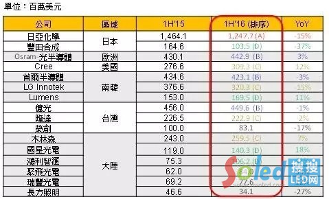 2016年上半日亞化學(xué)光半導(dǎo)體事業(yè)部營(yíng)收為12.5億美元,較2015年同期衰退15%,主因LCD顯示器用LED背光出貨量減、照明用LED價(jià)格遭受陸廠競(jìng)爭(zhēng)所致;另,值得注意的是,該公司營(yíng)業(yè)利益與2015年上半相較減幅達(dá)48%,為歷年罕見(jiàn)。