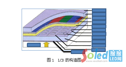 以TFT類型的液晶顯示屏為例,其構(gòu)造中主要包含背光源、導(dǎo)光板、上下偏振片、液晶、彩色濾光片、薄膜晶體管等(構(gòu)造示意圖見圖1),主要構(gòu)造的作用說明如下: