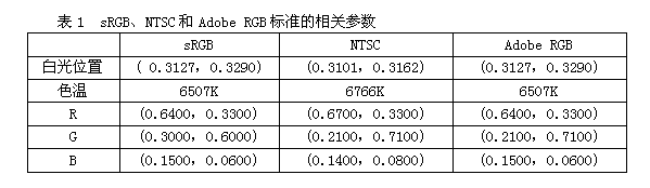 表1  sRGB、NTSC和Adobe RGB標(biāo)準(zhǔn)的相關(guān)參數(shù)