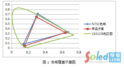 結(jié)合色域覆蓋率的概念,可以推出NTSC色域就是某一RGB三基色坐標(biāo)組成的三角形區(qū)域與NTSC標(biāo)準(zhǔn)RGB三個色坐標(biāo)組成的三角形區(qū)域的比值(示意圖如圖2),比值越高,色彩的表現(xiàn)力越好。