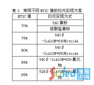 表3  常用不同NTSC值的白光實現(xiàn)方案