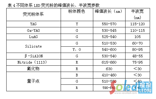 表4不同體系LED熒光粉的峰值波長、半波寬參數(shù)