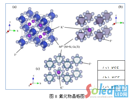 氟化物是4價錳激發(fā)的氟硅酸鹽,其分子式為 AxMFy:Mn4+(其中A=Li,Na,K,Ca,Sr,Ba等,M=Si,Al,Y,Sc等)。常用的氟化物熒光粉一般包含KSF、KGF、KTF三種體系,其中KSF屬于立方晶系,晶格圖如圖8中,KGF、KTF屬于六方晶系(晶格圖如下圖8),中文名稱為:4價錳激發(fā)的氟硅酸鉀/鍺/鈦,其化學(xué)式分別為K2SiF6:Mn4+、K2GeF6:Mn4+、K2TiF6:Mn4+,化學(xué)式與硅酸鹽類似(硅酸鹽化學(xué)式:XSiO2)。
