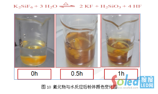 穩(wěn)定性:氟化物熒光粉自身結(jié)構(gòu)不穩(wěn)定,有一定的吸濕性,這項特性與硅酸鹽相似,且氟化物熒光粉在溫度升高時易與水發(fā)生分解反應(yīng)生成有毒的HF氣體,此反應(yīng)是可逆的,遇水后粉體外觀顏色由橙色變成褐色(如下圖10所示),化學(xué)反應(yīng)式為: