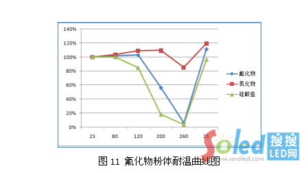 氟化物熒光粉不耐高溫,短時間內(nèi),隨著溫度的升高,熒光粉的亮度衰減增大,且在溫度>150℃的條件下衰減加速,但此反應(yīng)是可逆的,變化曲線如下:
