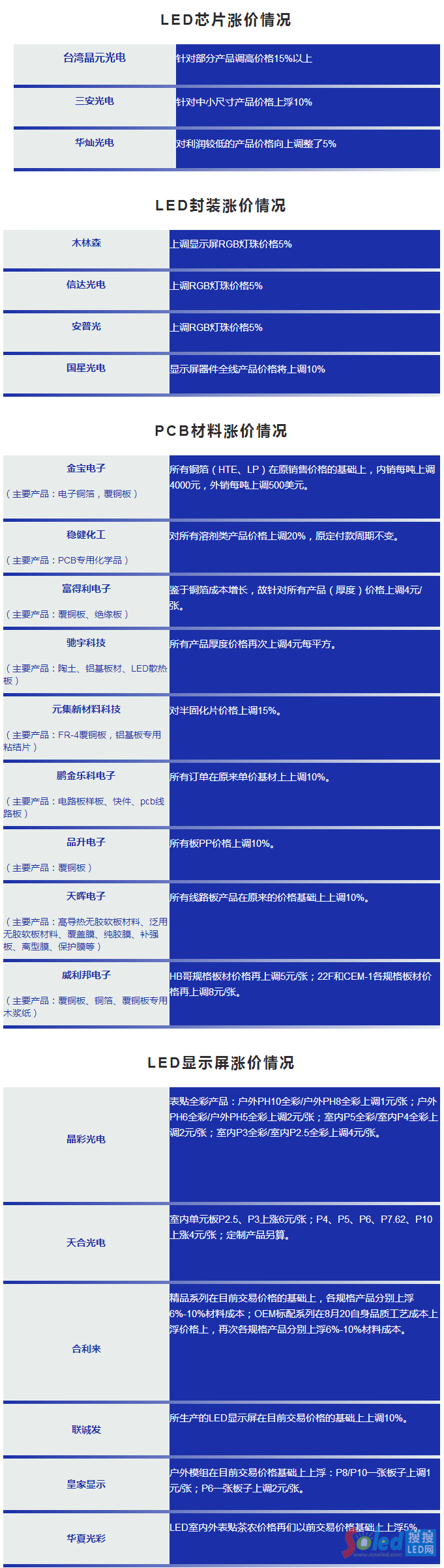 下面今年LED顯示屏產業(yè)各領域內企業(yè)漲價情況表: