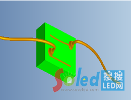 本文首先針對(duì)實(shí)際使用的小電極LED器件模型進(jìn)行了三維幾何構(gòu)建,如圖1所示。其中鍵合線由芯片電極植球引出,向支架焊盤處實(shí)現(xiàn)楔形鍵合。芯片、支架、鍵合線、封裝膠一一裝配約束。