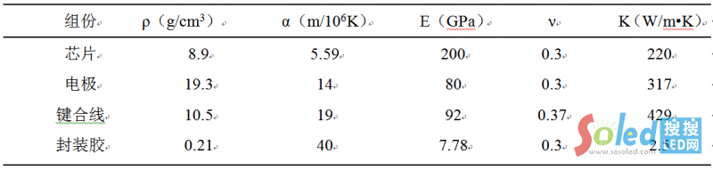 LED器件模型中的主要材料熱力學(xué)特性參數(shù)如表1所示,包括密度ρ、熱膨脹系數(shù)α、彈性模量E、泊松比ν和傳熱系數(shù)K。