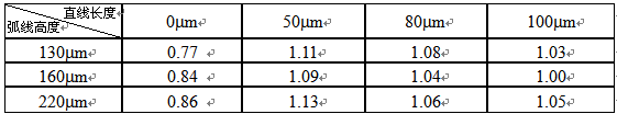 鍵合線線弧通常由直線段和弧線段組成,而不同直線段長(zhǎng)度與弧線段高度組成了不同的線弧模式。為了分析不同引線線弧模式對(duì)鍵合線的熱應(yīng)力影響,以冷熱沖擊下的最大等效熱應(yīng)力作為依據(jù),通過有限元數(shù)值模擬,針對(duì)不同直線長(zhǎng)度和弧線高度作正交計(jì)算對(duì)比,得到了小電極LED不同引線線弧模式下的最大熱應(yīng)力,如表3所示,以直線長(zhǎng)度100mm,弧線高度160mm線弧最大應(yīng)力值為基準(zhǔn)進(jìn)行歸一化處理。