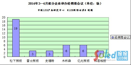 據(jù)不完全統(tǒng)計,2014年2月19日-4月10日,舉行經(jīng)銷商會議場數(shù)最多的是松下照明開關(guān),共19場,排在第1位;木林森照明與億光LED照明,分別舉行了6場地方經(jīng)性銷商會議,并列第2位;雷士照明、科思栢麗、史福特照明則分別舉行了3場地方性經(jīng)銷商會議,并列第3位。