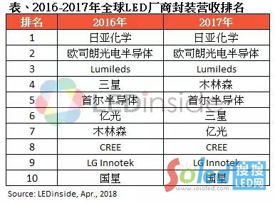LEDinside研究協(xié)理儲于超指出,由于照明與顯示屏市場的需求增加,木林森產(chǎn)能持續(xù)擴大,營收排名從2016年的第七名攀升至全球第四。首爾半導(dǎo)體則受惠于背光CSP、閃光燈、照明、車用與不可見光訂單營收大幅成長,2017年排名保持第五。