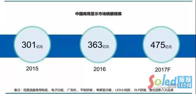 據(jù)奧維云網(wǎng)數(shù)據(jù)顯示,2017年商顯市場(chǎng)維持高增長(zhǎng),中國(guó)大陸商用顯示市場(chǎng)規(guī)模達(dá)475億元,而相關(guān)專家也對(duì)未來(lái)商顯市場(chǎng)進(jìn)行展望,并預(yù)測(cè)在2018年,中國(guó)商顯整體市場(chǎng)將達(dá)到588.8億元的規(guī)模。商顯市場(chǎng)巨大的潛力,讓嘗到了甜頭的LED顯示屏企業(yè)趨之若鶩,不斷加大研發(fā)生產(chǎn)力度,以“小間距”為代表的LED顯示屏,繼續(xù)著這場(chǎng)與DLP、LCD的市場(chǎng)爭(zhēng)奪戰(zhàn)。