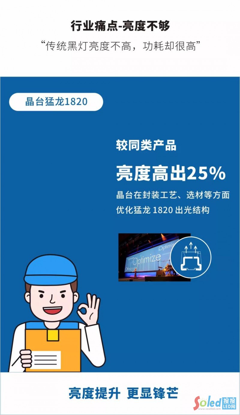 隨著顯示屏細(xì)分化市場(chǎng)日趨成熟,行業(yè)總體向更小的像素間距發(fā)展,其中戶外租賃市場(chǎng)發(fā)展迅猛,在歌舞晚會(huì)、展覽展示、高端會(huì)議等場(chǎng)合都能見到它的身影,但在產(chǎn)品使用過(guò)程中,卻出現(xiàn)了一些戶外顯示“痛點(diǎn)”。晶臺(tái)總結(jié)研發(fā)經(jīng)驗(yàn),把準(zhǔn)封裝發(fā)展脈搏,繼大熱產(chǎn)品猛龍2525后推出猛龍1820,一經(jīng)亮相,就贏得客戶認(rèn)可。1820究竟有何種魅力?我們一探究竟。