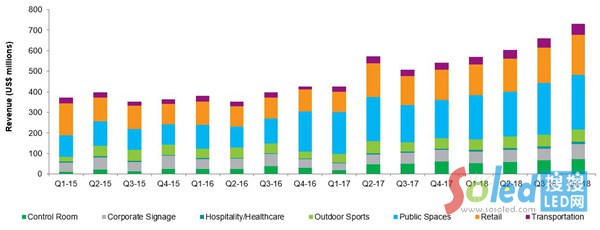 3)戶內(nèi)LED顯示屏在Q2銷(xiāo)售額最多,占近60%份額。FPP和2-4.99mm點(diǎn)間距是Q2銷(xiāo)售額最多的兩類(lèi)產(chǎn)品,貢獻(xiàn)33%的業(yè)績(jī)。5-9.99mm點(diǎn)間距產(chǎn)品排名第三,貢獻(xiàn)30%的業(yè)績(jī)。大多數(shù)戶內(nèi)LED顯示屏的銷(xiāo)售是在Public spaces市場(chǎng)產(chǎn)生的,而增長(zhǎng)最快的應(yīng)用市場(chǎng)是Control Room。預(yù)計(jì)在2018-2021年,Transportation將成為戶內(nèi)LED顯示屏銷(xiāo)售額復(fù)合增長(zhǎng)率最快的應(yīng)用市場(chǎng),年度增長(zhǎng)達(dá)28%。