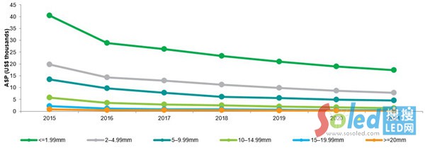 1) 所有點(diǎn)間距的LED顯示屏在2015-2021年銷(xiāo)售價(jià)格(US$/㎡)均呈現(xiàn)逐年下降趨勢(shì)。FPP和點(diǎn)間距<10mm產(chǎn)品的價(jià)格下降幅度預(yù)計(jì)不會(huì)像其它類(lèi)型產(chǎn)品那么激烈。隨著越來(lái)越多的中國(guó)廠家利用物美價(jià)廉的LED顯示模塊和OEM進(jìn)入全球新興市場(chǎng),市場(chǎng)競(jìng)爭(zhēng)也會(huì)越來(lái)越激烈。隨著制造商大量采用新的系統(tǒng)組件和電子系統(tǒng)來(lái)打造市場(chǎng)競(jìng)爭(zhēng)力,LED顯示屏原材料價(jià)格也會(huì)經(jīng)常性的上下波動(dòng)。