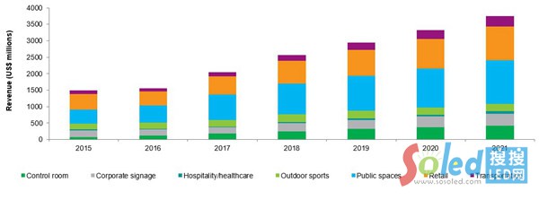 2018-2021年全球LED顯示屏品牌市場(chǎng)將保持14%的銷(xiāo)售額復(fù)合增長(zhǎng)和12%的銷(xiāo)售面積復(fù)合增長(zhǎng),5-9.99mm和10-14.99mm將成為市場(chǎng)上主要產(chǎn)品,F(xiàn)PP(≤ 1.99mm)和2-4.99mm將成為增長(zhǎng)最快的兩個(gè)產(chǎn)品。Public spaces和Retail將是其中最大的兩個(gè)應(yīng)用市場(chǎng),Transportation和Control Room將是增長(zhǎng)最快的兩個(gè)應(yīng)用市場(chǎng)。所有點(diǎn)間距的顯示屏價(jià)格均呈逐年下降趨勢(shì)。FPP和點(diǎn)間距<10mm產(chǎn)品的價(jià)格下降幅度將不會(huì)像其它產(chǎn)品那么激烈。
