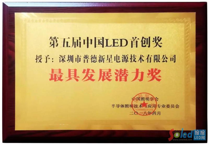 據(jù)了解,“中國LED首創(chuàng)獎”是國內技術創(chuàng)新領域的國家級大獎,是為表彰在中國LED行業(yè)首度創(chuàng)新和自主創(chuàng)新方面做出突出貢獻的企業(yè)和個人而設立的年度獎項。此次,普德新星憑借出色的產品優(yōu)勢、領先的科研成果和出眾的市場表現(xiàn),獲頒2018中國LED首創(chuàng)獎-最具發(fā)展?jié)摿r值獎,是對其在LED電源領域多年耕耘,持續(xù)創(chuàng)新的肯定。