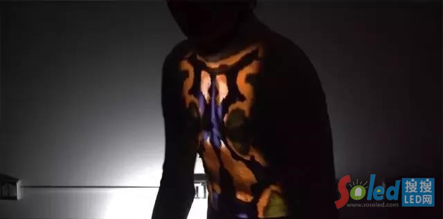 在這項(xiàng)技術(shù)的最新版本上,增加了一個(gè)三維光映射元素,進(jìn)一步加深了視覺(jué)上的錯(cuò)覺(jué),使投影看起來(lái)像一個(gè)真實(shí)的發(fā)光3D物體。演示視頻中顯示了各種拉伸紋理,實(shí)時(shí)響應(yīng)運(yùn)動(dòng),反射光源的金屬在上面閃閃發(fā)光,看起來(lái)像是一個(gè)奇怪的,不均勻的有機(jī)形態(tài),像是一條纏繞在移動(dòng)人體上的“外星蛇”。