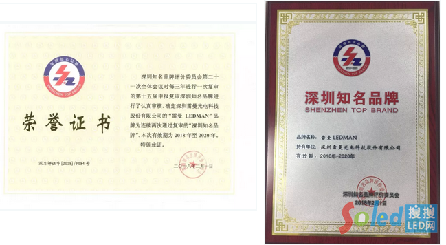 第十五屆“深圳知名品牌”評價活動于2017年3月28日正式啟動, 2018年1月19日,深圳知名品牌評價委員會對第十五屆“深圳知名品牌”評價活動,完成企業(yè)申報、企業(yè)內(nèi)部管理體系現(xiàn)場評審、社會公眾投票、行業(yè)專家評價和品牌價值評估工作,評價委全體會議進(jìn)行了審議評選。經(jīng)深圳市公證處現(xiàn)場公證,確定認(rèn)定和入選了8個品牌為第四屆“國際信譽(yù)品牌”, 56個品牌為第十五屆“深圳知名品牌”,169個品牌通過深圳知名品牌復(fù)評。深圳雷曼光電科技股份有限公司“雷曼 LEDMAN”品牌為連續(xù)兩次通過復(fù)審的“深圳知名品牌”。