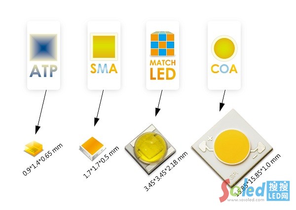 | 圖二:小至0.9*1.4*0.5mm立方的芯圓級(jí)覆芯封裝ATP、高度僅0.5mm的極輕薄化覆芯元件SMA、主流規(guī)格的陶瓷基板覆芯元件MATCH LED、超過3,000流明的覆芯集成元件COA。 |