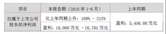據(jù)公告顯示,2018年1月1日-2018年6月30日,公司實(shí)現(xiàn)歸屬于上市公司股東的凈利潤10,000萬元-10,785萬元,比上年同期3,456.86萬元上升189%-212%。