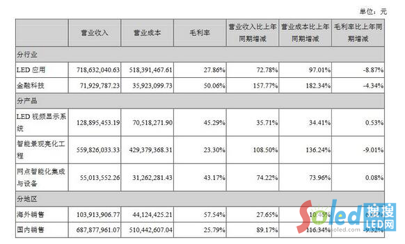 按產(chǎn)品來看營收構(gòu)成,公司的主要產(chǎn)品包括:LED視頻顯示系統(tǒng)、LED信息發(fā)布系統(tǒng)、智能景觀亮化工程、網(wǎng)點(diǎn)智能化集成與設(shè)備、服務(wù)、軟件集成及其它。其中,LED視頻顯示系統(tǒng)實(shí)現(xiàn)營收1.29億元,占總營收的比重為16.28%,毛利率為45.29%。智能景觀亮化工程實(shí)現(xiàn)營收5.6億元,占總營收的比重為70.7%,毛利率為23.30%。