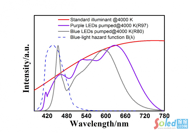Purple LEDs pumped 4000 K(Ra97,Rf96)