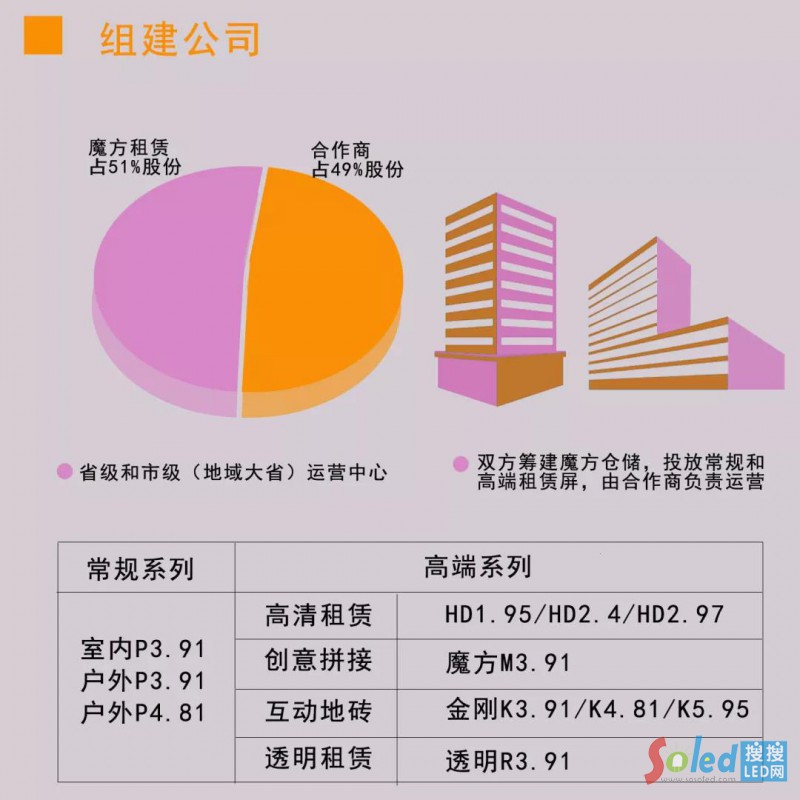 魔方租賃公司占51%股份,而合作商占49%的股份,由雙方籌建魔方倉儲(chǔ),投放常規(guī)和高端租賃屏,由合作商負(fù)責(zé)經(jīng)營。
