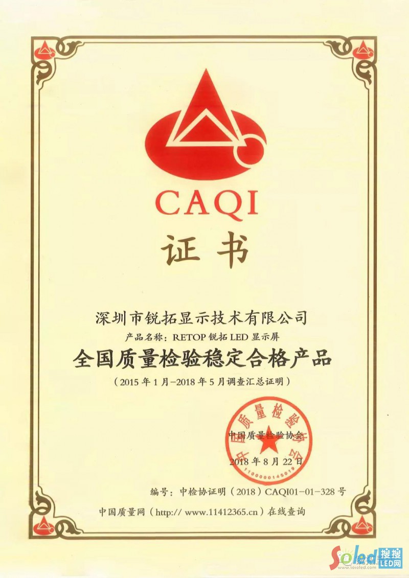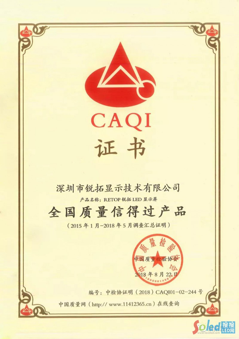 國(guó)家為促進(jìn)質(zhì)量強(qiáng)國(guó)建設(shè)。對(duì)管理水平較高在質(zhì)量提升、質(zhì)量責(zé)任、質(zhì)量安全、質(zhì)量誠(chéng)信、質(zhì)量水平、質(zhì)量發(fā)展、質(zhì)量創(chuàng)新等方面具有良好示范帶頭作用的質(zhì)量誠(chéng)信標(biāo)桿典型企業(yè)《深圳市銳拓顯示技術(shù)有限公司》,經(jīng)由中國(guó)質(zhì)量檢驗(yàn)協(xié)會(huì)針對(duì)2015年至2018年的審核與調(diào)查匯總和2018年國(guó)家34部門(mén)批準(zhǔn),由中國(guó)質(zhì)量檢驗(yàn)協(xié)會(huì)頒發(fā)的“全國(guó)質(zhì)量檢驗(yàn)穩(wěn)定合格產(chǎn)品”與“全國(guó)質(zhì)量信得過(guò)產(chǎn)品”兩項(xiàng)榮譽(yù)證書(shū)。