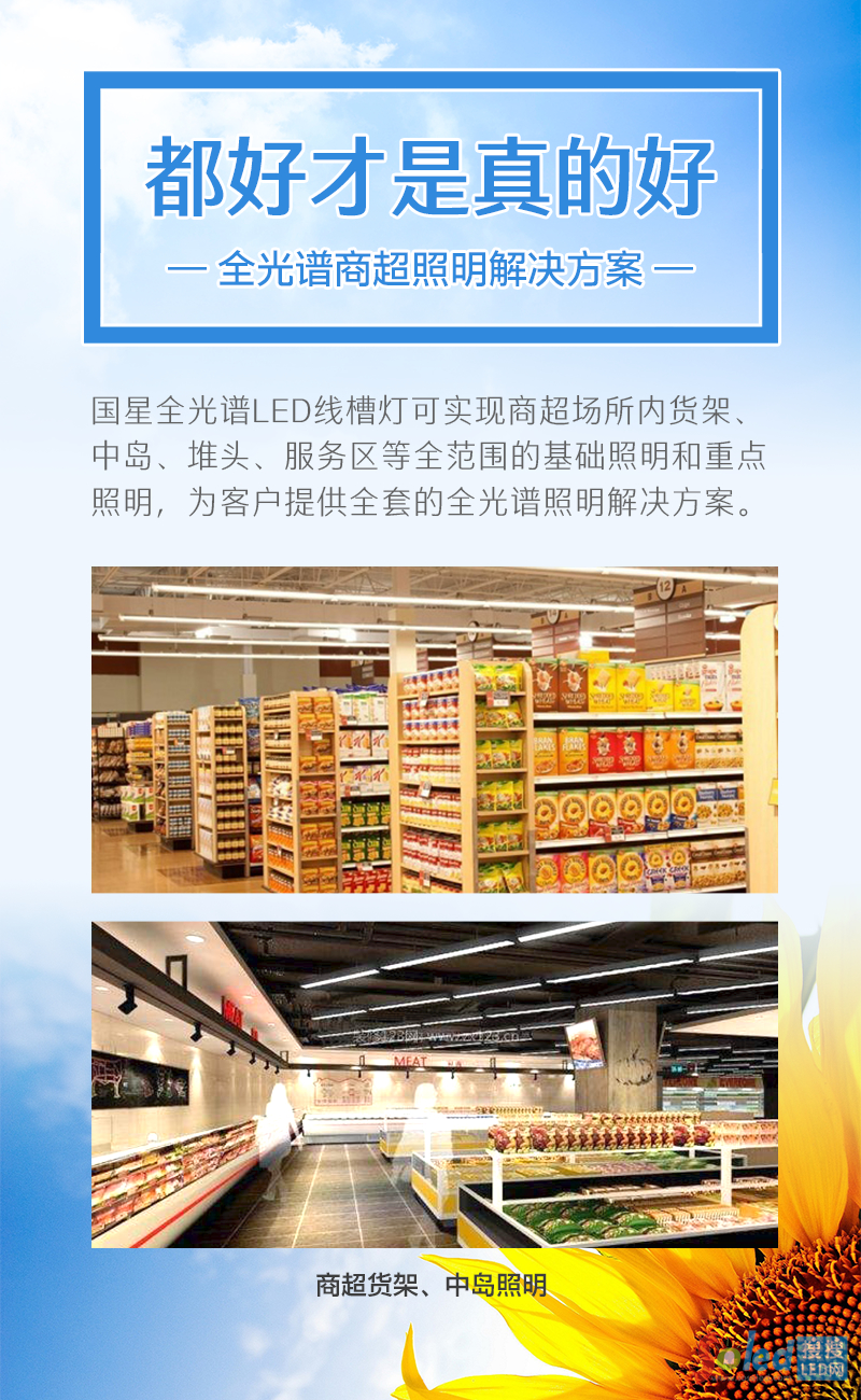目前,國(guó)星全光譜商超照明解決方案已經(jīng)在市場(chǎng)得到大范圍推廣應(yīng)用,并取得了可喜的成效。下一步,國(guó)星照明將加大研發(fā)投入力度,全方位為客戶(hù)提供更健康、高效的照明應(yīng)用解決方案。