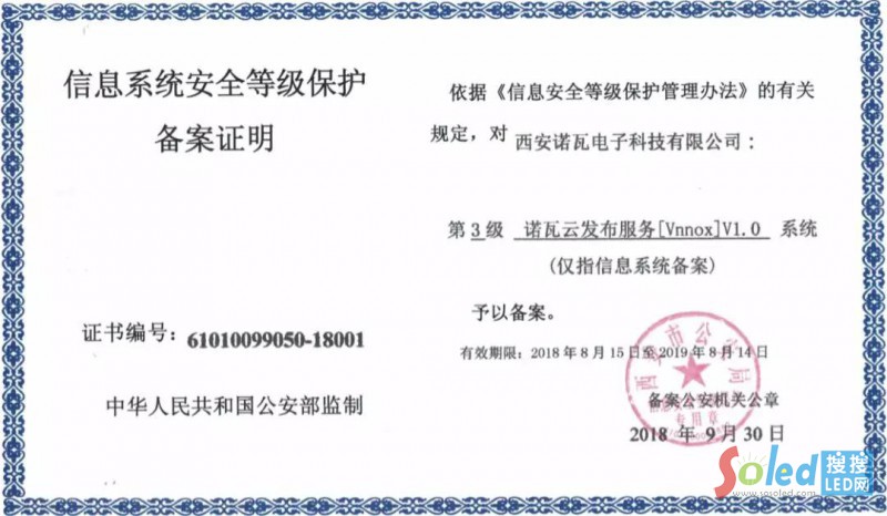 9月30日,諾瓦憑借Vnnox云發(fā)布系統(tǒng),成功通過公安部“信息系統(tǒng)安全等級保護(hù)”三級認(rèn)證,獲得了由公安部核準(zhǔn)頒發(fā)的《信息系統(tǒng)安全等級保護(hù)備案證明》,成為LED行業(yè)極少數(shù)獲此資質(zhì)的企業(yè)之一。