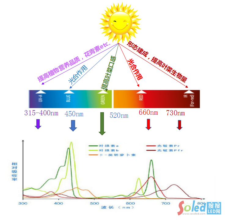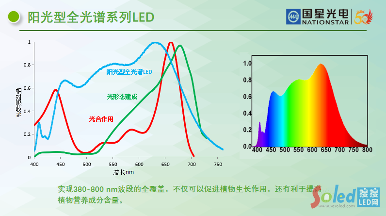 陽(yáng)光型全光譜系列LED,實(shí)現(xiàn)380-800 nm波段的全覆蓋,不僅可以促進(jìn)植物生長(zhǎng)作用,還有利于提高植物營(yíng)養(yǎng)成分含量。