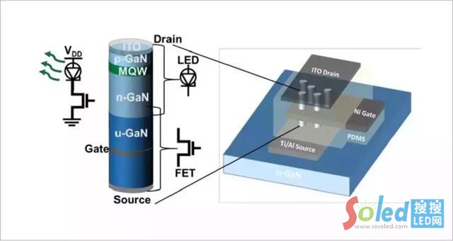 羅徹斯特理工學(xué)院的馬修(Matthew Hartensveld)和張敬在 IEEE Electron Device Letter 期刊上發(fā)表了一項(xiàng)研究,描述了他們將納米線氮化鎵場效電晶體(field-effect transistors,簡稱“FETs”)和氮化銦鎵 LED 集成在一起的方法。在這個(gè)有創(chuàng)意的新結(jié)構(gòu)中,電晶體被放置在 LED 下面以實(shí)現(xiàn)控制和調(diào)光。