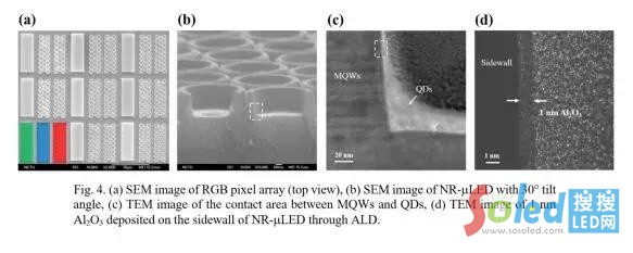 由于藍(lán)綠光的LED是由銦氮化鎵基材料為主,因?yàn)榫w結(jié)構(gòu)的關(guān)系,是一種壓電材料,本身具有很強(qiáng)的內(nèi)建電場,會(huì)影響主動(dòng)區(qū)的發(fā)光波長與載子復(fù)合效率,這個(gè)現(xiàn)象稱為量子史I限塔克效應(yīng)(quantum confined Stark effect; QCSE),是困擾LED發(fā)光效率的主要原因之一,因此該研究團(tuán)隊(duì)利用QCSE的特性,在綠光磊芯片上通過環(huán)型奈米結(jié)構(gòu)的制作,釋放LED主動(dòng)區(qū)的應(yīng)力來實(shí)現(xiàn)波長調(diào)變的效果,并將發(fā)光波長由綠光調(diào)變至藍(lán)光;由于奈米結(jié)構(gòu)會(huì)犧牲掉部分發(fā)光面積而降低發(fā)光強(qiáng)度,且Micro-LED隨著尺寸的減小,側(cè)壁缺陷對芯片的影響程度則會(huì)變大,進(jìn)而導(dǎo)致芯片發(fā)光效率的降低,因此郭教授研究團(tuán)隊(duì)導(dǎo)入了原子層沉積(ALD)薄膜鈍化保護(hù)技術(shù)取代傳統(tǒng)的電漿輔助化學(xué)氣相沉積(PECVD)的方式,藉由ALD鈍化保護(hù)層具有高致密度、高階梯覆蓋能力及有效的缺陷修復(fù)等特性,避免載子在芯片表面被缺陷捕捉,大幅提高了元件的發(fā)光強(qiáng)度,進(jìn)而提升效率。