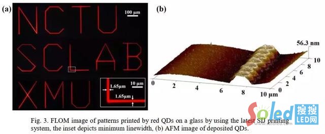 由于制備的每個(gè)RGB子像素的尺寸僅為3 μm * 10 μm,因此在小面積上實(shí)現(xiàn)量子點(diǎn)材料的精確噴涂也是該研究的一大亮點(diǎn)所在。該研究團(tuán)隊(duì)所采用的高精度量子點(diǎn)噴涂技術(shù),可實(shí)現(xiàn)1.65 μm線寬的均勻噴涂(如圖所示),噴涂精度可以很好地滿足要求。