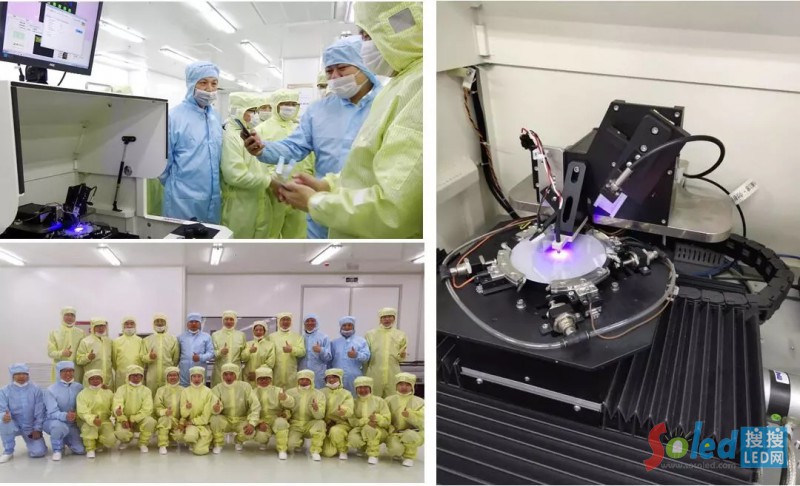 隨后,董事會一行參觀了外延MOCVD車間、質(zhì)檢間、芯片蒸鍍車間、清洗車間、黃光站、全測站,沿線有外延和芯片的工程師們演示芯片的生產(chǎn)過程。在外延車間,董事會一行聚集在一臺設(shè)備前,觀看外延片生長情況,副總經(jīng)理邱圣杰做了詳細講解。在芯片點測間,董事會一行觀看芯片的點亮過程,一枚4寸的wafer晶圓在工程師的操作下被成功點亮,發(fā)出幽藍的光芒。據(jù)介紹,經(jīng)過近4個月的設(shè)備調(diào)試,江西基地的芯片性能已經(jīng)得到極大的提升,比如目前演示的4寸的wafer晶圓,其光電學(xué)性能達到了廈門公司同款產(chǎn)品的水準。這標志著江西基地自建設(shè)以來,在生產(chǎn)研發(fā)上取得了階段性的進展。